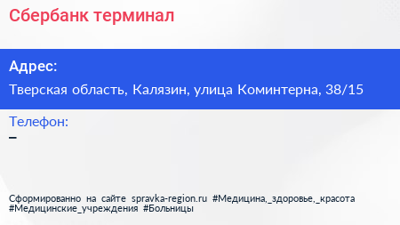 Сбербанк, терминал по адресу Тверская область, Калязин, улица Коминтерна, 38/15 в дальнейшем Организация, размещена в следующих категориях: