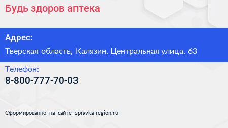 Будь здоров, аптека по адресу Тверская область, Калязин, Центральная улица, 63 в дальнейшем Организация, размещена в следующих категориях: