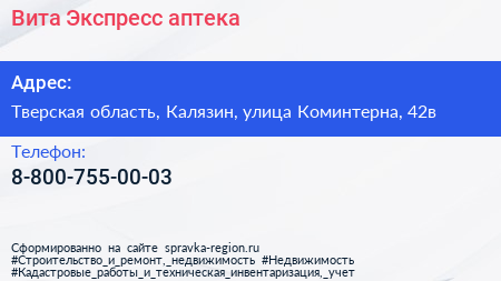 Вита Экспресс, аптека по адресу Тверская область, Калязин, улица Коминтерна, 42в в дальнейшем Организация, размещена в следующих категориях: