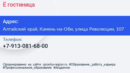 Ё, гостиница по адресу Алтайский край, Камень-на-Оби, улица Революции, 107 в дальнейшем Организация, размещена в следующих категориях: