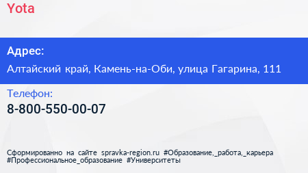 Yota по адресу Алтайский край, Камень-на-Оби, улица Гагарина, 111 в дальнейшем Организация, размещена в следующих категориях:
