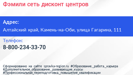 Фэмили, сеть дисконт-центров по адресу Алтайский край, Камень-на-Оби, улица Гагарина, 111 в дальнейшем Организация, размещена в следующих категориях: