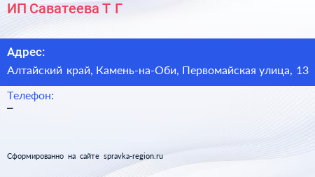 ИП Саватеева Т.Г. по адресу Алтайский край, Камень-на-Оби, Первомайская улица, 13 в дальнейшем Организация, размещена в следующих категориях: