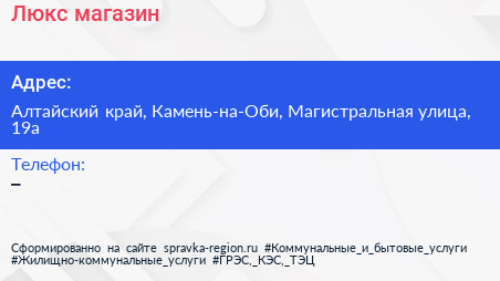 Люкс, магазин по адресу Алтайский край, Камень-на-Оби, Магистральная улица, 19а в дальнейшем Организация, размещена в следующих категориях: