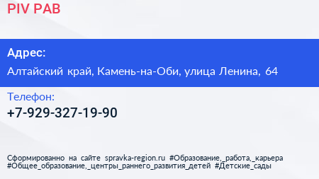 PIV-PAB по адресу Алтайский край, Камень-на-Оби, улица Ленина, 64 в дальнейшем Организация, размещена в следующих категориях: