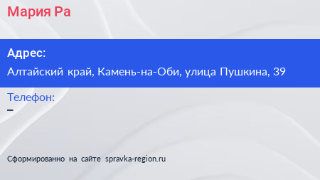 Мария-Ра по адресу Алтайский край, Камень-на-Оби, улица Пушкина, 39 в дальнейшем Организация, размещена в следующих категориях: