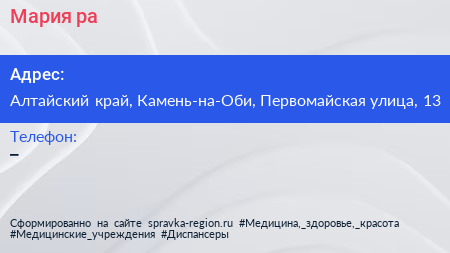 Мария-ра по адресу Алтайский край, Камень-на-Оби, Первомайская улица, 13 в дальнейшем Организация, размещена в следующих категориях: