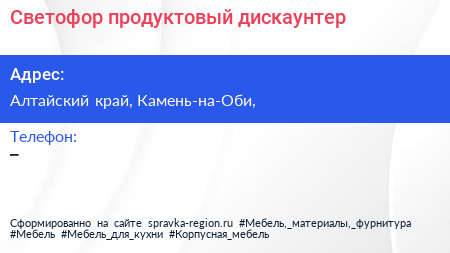 Светофор, продуктовый дискаунтер по адресу Алтайский край, Камень-на-Оби, в дальнейшем Организация, размещена в следующих категориях:
