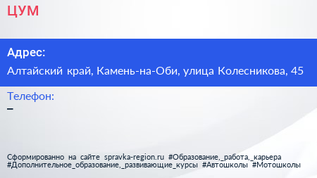ЦУМ по адресу Алтайский край, Камень-на-Оби, улица Колесникова, 45 в дальнейшем Организация, размещена в следующих категориях: