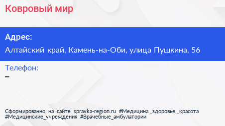 Ковровый мир по адресу Алтайский край, Камень-на-Оби, улица Пушкина, 56 в дальнейшем Организация, размещена в следующих категориях: