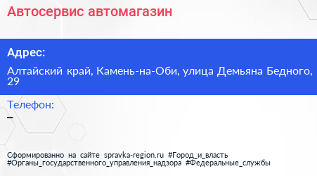 Автосервис-автомагазин по адресу Алтайский край, Камень-на-Оби, улица Демьяна Бедного, 29 в дальнейшем Организация, размещена в следующих категориях: