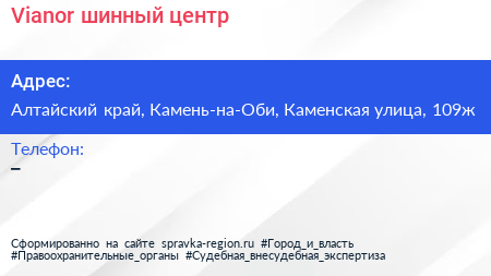 Vianor, шинный центр по адресу Алтайский край, Камень-на-Оби, Каменская улица, 109ж в дальнейшем Организация, размещена в следующих категориях: