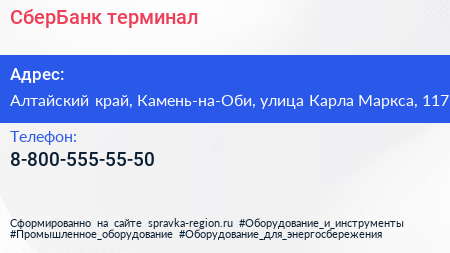 СберБанк, терминал по адресу Алтайский край, Камень-на-Оби, улица Карла Маркса, 117 в дальнейшем Организация, размещена в следующих категориях: