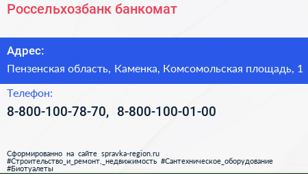 Россельхозбанк, банкомат по адресу Пензенская область, Каменка, Комсомольская площадь, 1 в дальнейшем Организация, размещена в следующих категориях: