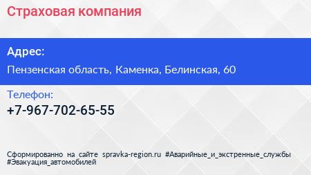 Страховая компания по адресу Пензенская область, Каменка, Белинская, 60 в дальнейшем Организация, размещена в следующих категориях: