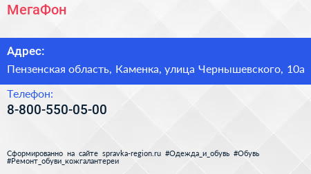 МегаФон по адресу Пензенская область, Каменка, улица Чернышевского, 10а в дальнейшем Организация, размещена в следующих категориях: