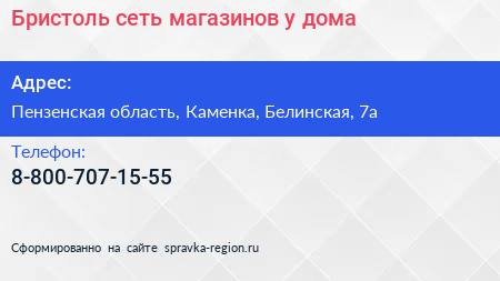 Бристоль, сеть магазинов у дома по адресу Пензенская область, Каменка, Белинская, 7а в дальнейшем Организация, размещена в следующих категориях: