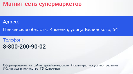 Магнит, сеть супермаркетов по адресу Пензенская область, Каменка, улица Белинского, 54 в дальнейшем Организация, размещена в следующих категориях: