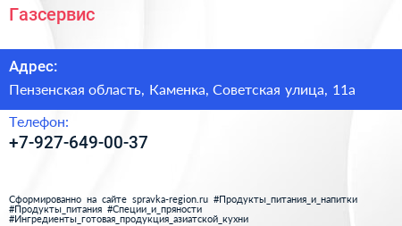 Газсервис по адресу Пензенская область, Каменка, Советская улица, 11а в дальнейшем Организация, размещена в следующих категориях: