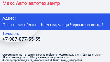 Макс-Авто, автотехцентр по адресу Пензенская область, Каменка, улица Чернышевского, 1а в дальнейшем Организация, размещена в следующих категориях: