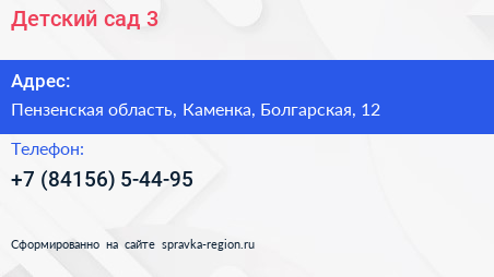 Детский сад №3 по адресу Пензенская область, Каменка, Болгарская, 12 в дальнейшем Организация, размещена в следующих категориях: