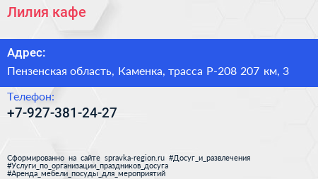 Лилия, кафе по адресу Пензенская область, Каменка, трасса Р-208 207 км, 3 в дальнейшем Организация, размещена в следующих категориях: