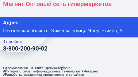 Магнит Оптовый, сеть гипермаркетов по адресу Пензенская область, Каменка, улица Энергетиков, 5 в дальнейшем Организация, размещена в следующих категориях: