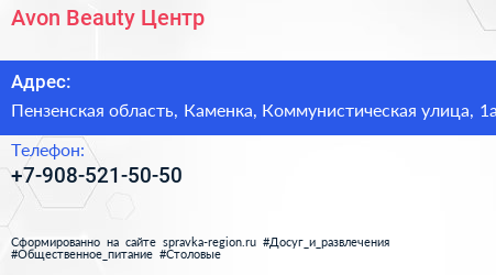 Avon Beauty Центр по адресу Пензенская область, Каменка, Коммунистическая улица, 1а в дальнейшем Организация, размещена в следующих категориях: