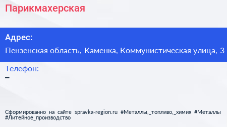Парикмахерская по адресу Пензенская область, Каменка, Коммунистическая улица, 3 в дальнейшем Организация, размещена в следующих категориях: