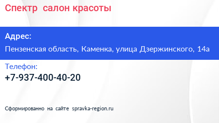 Спектр+, салон красоты по адресу Пензенская область, Каменка, улица Дзержинского, 14а в дальнейшем Организация, размещена в следующих категориях: