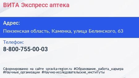 ВИТА Экспресс, аптека по адресу Пензенская область, Каменка, улица Белинского, 63 в дальнейшем Организация, размещена в следующих категориях: