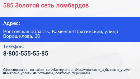 585*Золотой, сеть ломбардов по адресу Ростовская область, Каменск-Шахтинский, улица Ворошилова, 20 в дальнейшем Организация, размещена в следующих категориях: