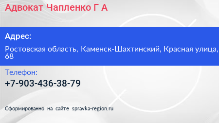Адвокат Чапленко Г.А. по адресу Ростовская область, Каменск-Шахтинский, Красная улица, 68 в дальнейшем Организация, размещена в следующих категориях: