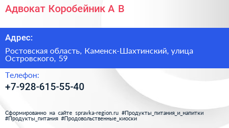 Адвокат Коробейник А.В. по адресу Ростовская область, Каменск-Шахтинский, улица Островского, 59 в дальнейшем Организация, размещена в следующих категориях: