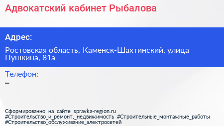 Адвокатский кабинет Рыбалова по адресу Ростовская область, Каменск-Шахтинский, улица Пушкина, 81а в дальнейшем Организация, размещена в следующих категориях: