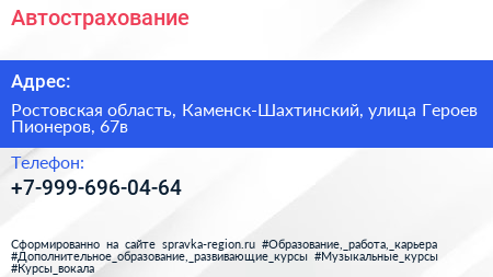 Автострахование по адресу Ростовская область, Каменск-Шахтинский, улица Героев Пионеров, 67в в дальнейшем Организация, размещена в следующих категориях: