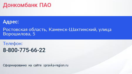Донкомбанк, ПАО по адресу Ростовская область, Каменск-Шахтинский, улица Ворошилова, 5 в дальнейшем Организация, размещена в следующих категориях: