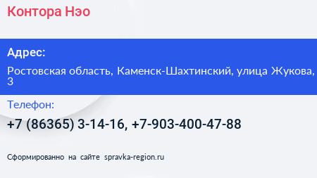 Контора-Нэо по адресу Ростовская область, Каменск-Шахтинский, улица Жукова, 3 в дальнейшем Организация, размещена в следующих категориях: