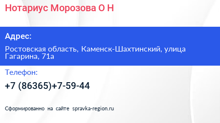 Нотариус Морозова О.Н. по адресу Ростовская область, Каменск-Шахтинский, улица Гагарина, 71а в дальнейшем Организация, размещена в следующих категориях: