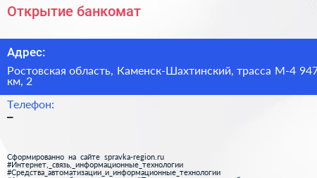 Открытие, банкомат по адресу Ростовская область, Каменск-Шахтинский, трасса М-4 947 км, 2 в дальнейшем Организация, размещена в следующих категориях: