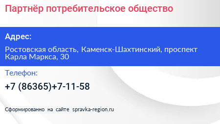 Партнёр, потребительское общество по адресу Ростовская область, Каменск-Шахтинский, проспект Карла Маркса, 30 в дальнейшем Организация, размещена в следующих категориях: