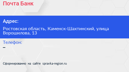 Почта Банк по адресу Ростовская область, Каменск-Шахтинский, улица Ворошилова, 13 в дальнейшем Организация, размещена в следующих категориях: