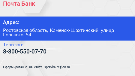 Почта Банк по адресу Ростовская область, Каменск-Шахтинский, улица Горького, 54 в дальнейшем Организация, размещена в следующих категориях: