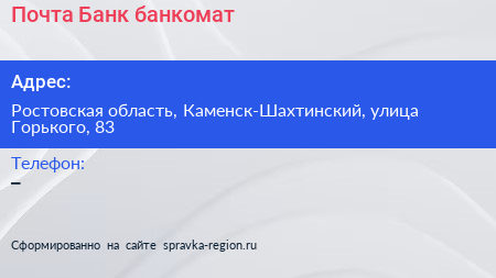 Почта Банк, банкомат по адресу Ростовская область, Каменск-Шахтинский, улица Горького, 83 в дальнейшем Организация, размещена в следующих категориях:
