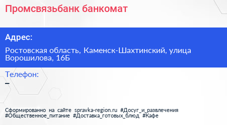 Промсвязьбанк, банкомат по адресу Ростовская область, Каменск-Шахтинский, улица Ворошилова, 16Б в дальнейшем Организация, размещена в следующих категориях: