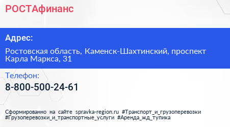 РОСТАфинанс по адресу Ростовская область, Каменск-Шахтинский, проспект Карла Маркса, 31 в дальнейшем Организация, размещена в следующих категориях: