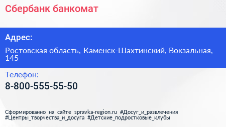 Сбербанк, банкомат по адресу Ростовская область, Каменск-Шахтинский, Вокзальная, 145 в дальнейшем Организация, размещена в следующих категориях:
