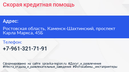 Скорая кредитная помощь по адресу Ростовская область, Каменск-Шахтинский, проспект Карла Маркса, 45Б в дальнейшем Организация, размещена в следующих категориях: