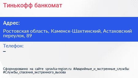 Тинькофф, банкомат по адресу Ростовская область, Каменск-Шахтинский, Астаховский переулок, 89 в дальнейшем Организация, размещена в следующих категориях: