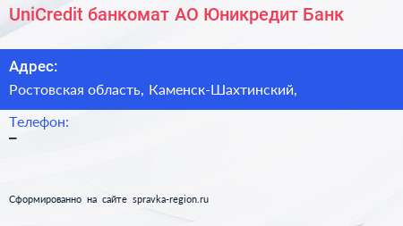 UniCredit, банкомат, АО Юникредит Банк по адресу Ростовская область, Каменск-Шахтинский, в дальнейшем Организация, размещена в следующих категориях: